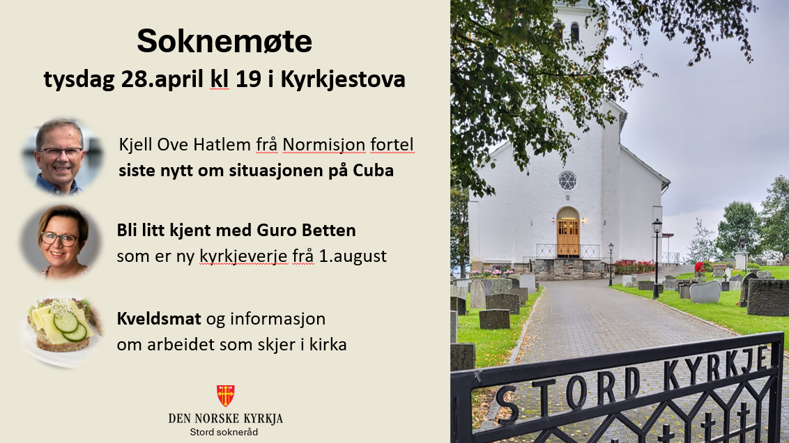Tysdag 28. april kl. 19.00 vert det soknemøte for Stord kyrkjelyd i Kyrkjestova. Eit soknemøte er eit ope møte for alle i kyrkjelyden ...