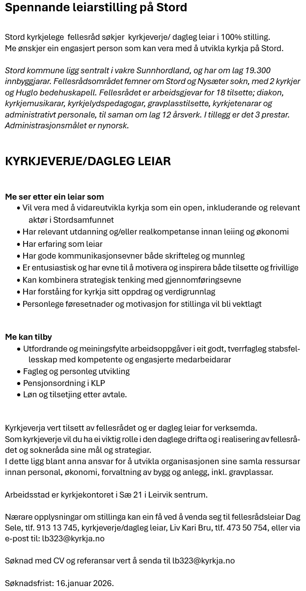 Stord kyrkjelege fellesråd søkjer kyrkjeverje/dagleg leiar i 100 % stilling. Me ønskjer ein engasjert person som kan vera med å utvikla kyrkja på Stord.